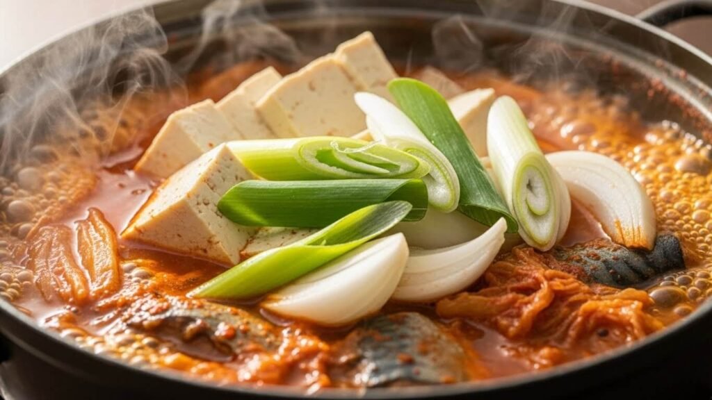 - 고등어가 충분히 익었다 싶을 때, 두부, 양파, 대파를 넣고 5분 정도 더 끓여줍니다.