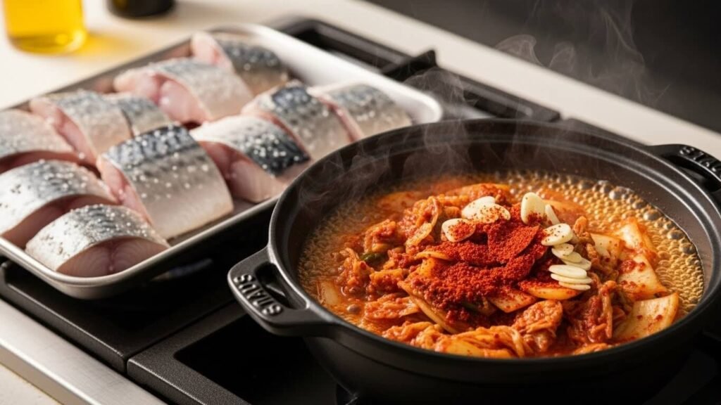 1단계: 고등어 밑간 & 김치 볶기 (풍미 살리기!)