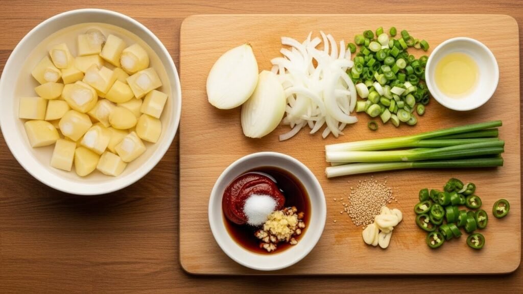 | 감자 3개 (중간 크기, 비슷한 크기로 썰기) | 대파 1/2대 (송송 썰기) |