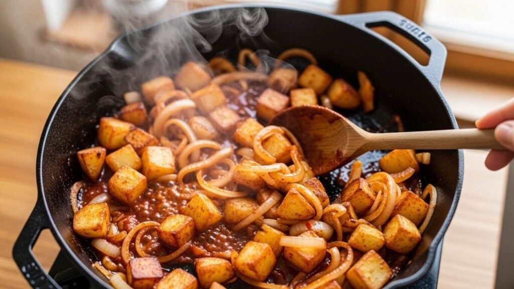 - 불을 약불~중약불로 줄이고 뚜껑을 덮어 5분 정도 끓여주세요. (감자 속까지 양념이 스며들고 부드럽게 익는 시간입니다.)