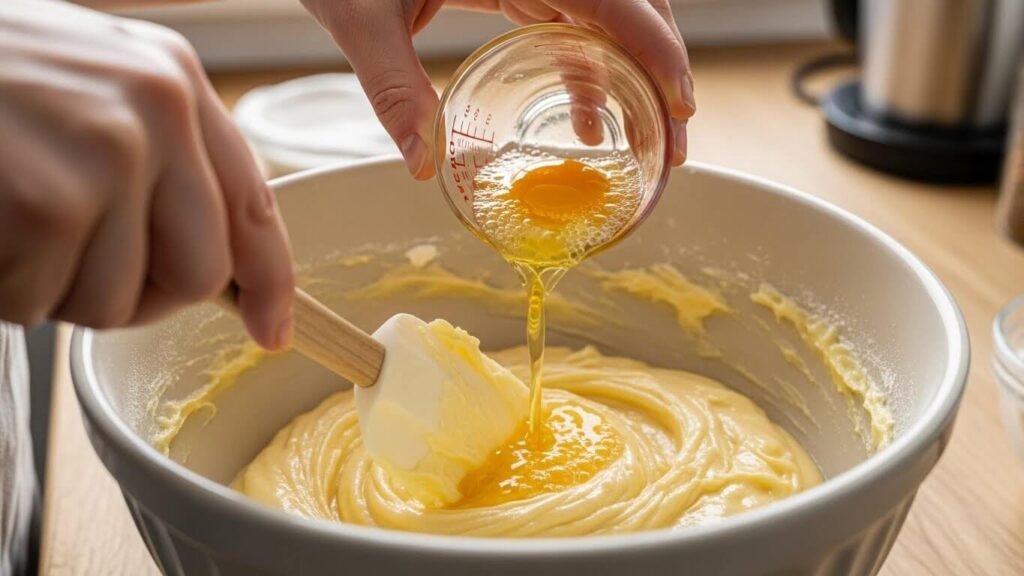 - 계란을 넣을 때마다 완전히 섞여 반죽이 뽀얗고 윤기 나면 다음 계란을 넣어주세요. (한 번에 넣으면 버터와 계란이 분리되어 케이크가 딱딱해집니다!)
