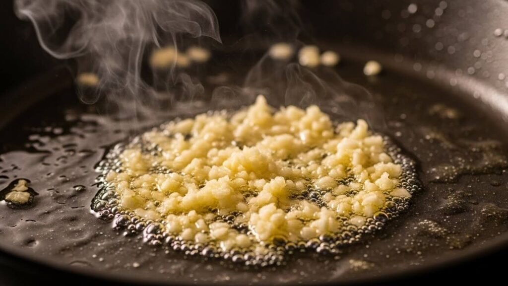 팬에 기름 두르고 다진 마늘을 먼저 넣어요. 지글지글 마늘 향이 올라오기 시작하면 → 이미 성공 50%!