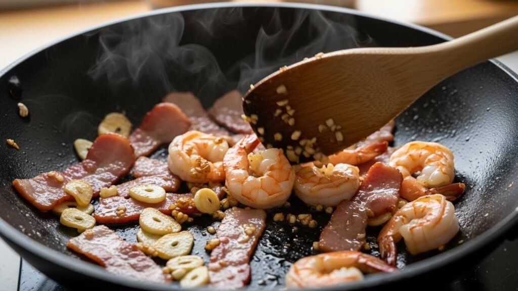 베이컨이든, 햄이든, 새우든 냉장고에 있는 단백질 재료를 먼저 볶아요. 기름에 감칠맛이 스며들게 해주는 게 포인트예요.