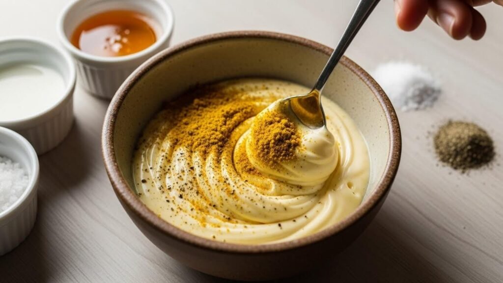 - 볼에 마요네즈 3큰술 + 카레가루 1큰술 + 소금·후추 약간을 넣고 섞어주세요.