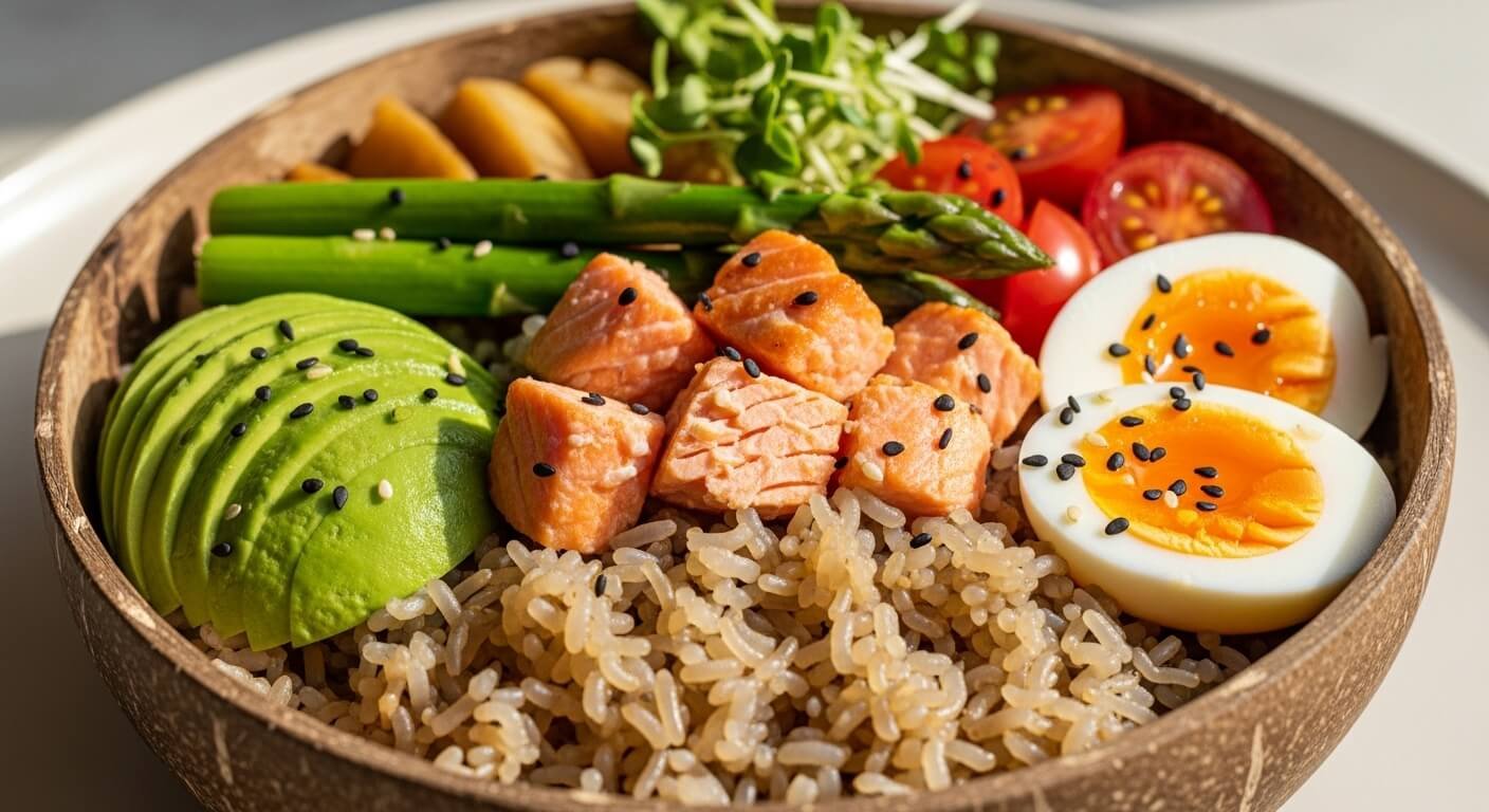 • 베이스: 곤약밥(또는 곤약쌀) + 현미밥 (1:1 비율 추천)