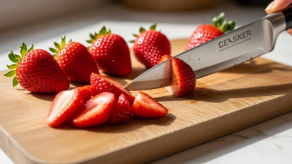 STEP 1. 딸기 단장하기 딸기를 깨끗이 씻어 꼭지를 떼어내고, 예쁜 유리컵에 담기 좋게 한 입 크기로 썰어주세요. 층층이 쌓을 거라 반은 슬라이스하고, 반은 작게 다지듯 썰면 식감이 더 재밌어져요!