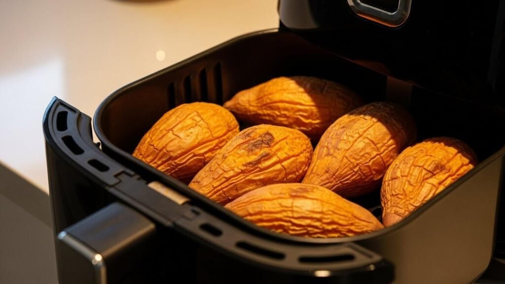 1. 고구마, 먼저 ‘사우나’ 좀 다녀올게! 깨끗이 씻은 고구마를 에어프라이어에 넣고 180도에서 20~25분 정도 구워주세요.