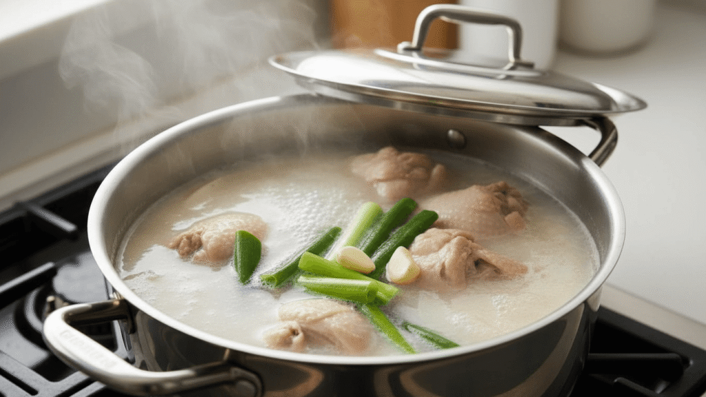 🐔 이 시간이 지나면 국물이 점점 뽀얗게 변하고, 닭살이 젓가락만 대도 툭 떨어질 정도로 부드러워질 거예요! 뚜껑은 살짝 열어두면 국물이 더 깔끔해집니다.