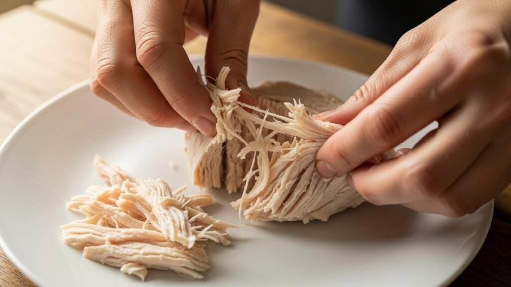 - 닭을 건져내서 먹기 좋은 크기로 찢어주세요. (너무 얇으면 건조하고, 너무 크면 식감이 떨어져요!)