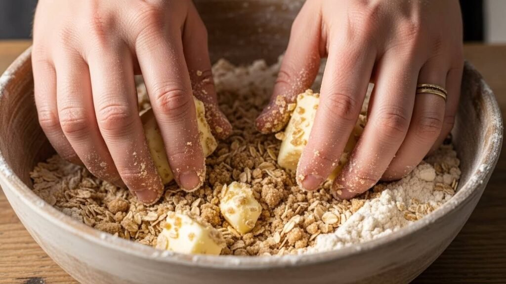 - 볼에 밀가루, 귀리, 설탕, 그리고 깍둑썰기 한 차갑고 단단한 버터를 모두 넣어주세요.