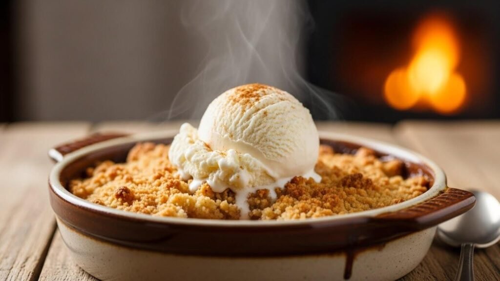 갓 구워 뜨끈뜨끈한 크럼블 위에 바닐라 아이스크림을 한 스쿱 올려보세요.