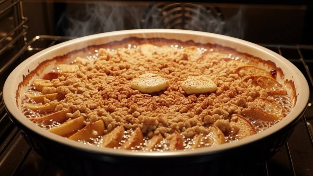 크럼블 토핑이 황금빛으로 노릇노릇 해지고, 그릇 가장자리에서 사과즙이 보글보글 끓어오르면 완성 신호! 온 집안에 시나몬 향이 가득 찰 거예요!