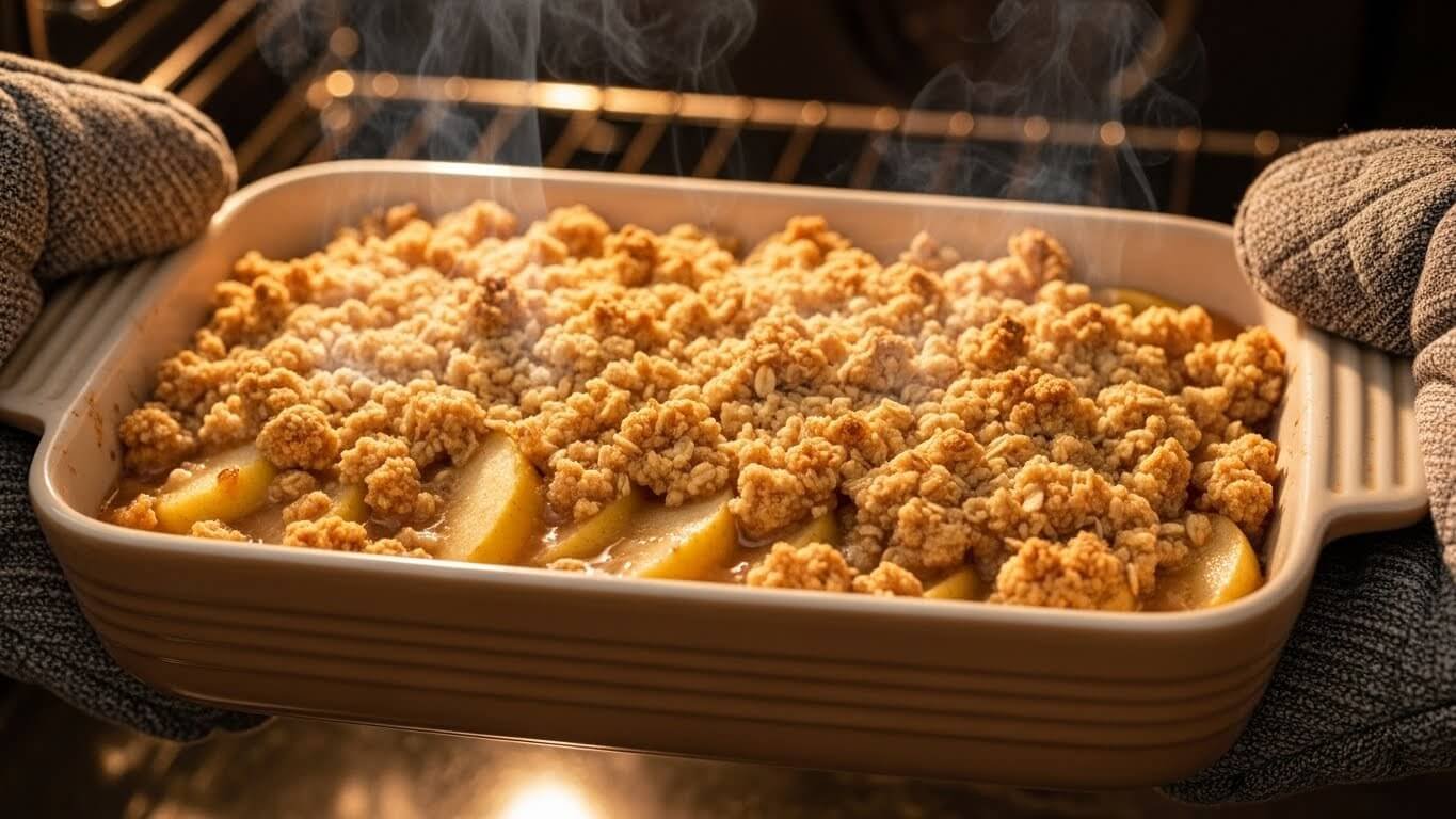 크럼블 토핑이 황금빛으로 노릇노릇 해지고, 그릇 가장자리에서 사과즙이 보글보글 끓어오르면 완성 신호! 온 집안에 시나몬 향이 가득 찰 거예요!