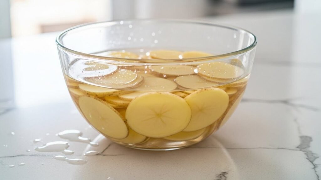 감자를 최대한 얇게 썰어 물에 5분 정도 담가주세요. 채반에 받쳐 물기를 싹 제거해 주는 것도 잊지 마세요!