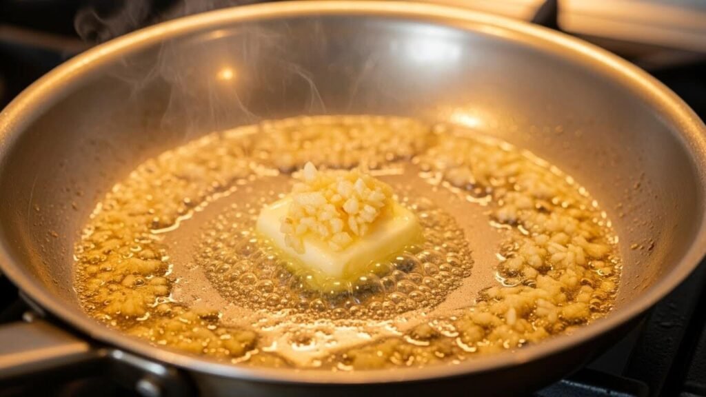 팬에 버터를 두르고 다진 마늘을 볶아주세요. 주방 가득 맛있는 향이 퍼지기 시작하면 이미 절반은 성공입니다. (양파나 베이컨이 있다면 이때 같이 볶아주세요!)