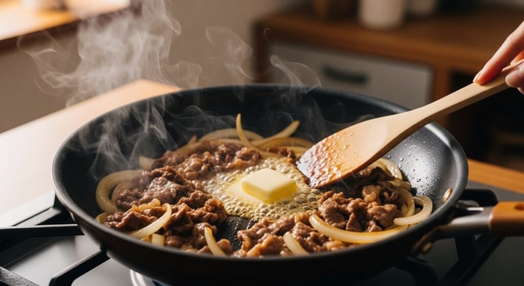 팬에 버터를 녹이고 채 썬 양파를 볶아주세요. 여기서 포인트는 양파가 투명함을 넘어 ‘살짝 갈색’이 될 때까지 인내심을 갖고 볶는 거예요. 이 과정이 소스의 풍미를 결정하는 가장 중요한 단계입니다!