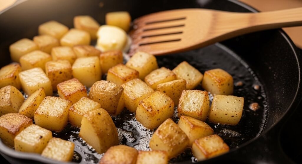 3. 팬에서 노릇하게 굽기 달궈진 프라이팬에 버터 1큰술을 녹이고 준비한 감자를 넣어주세요.