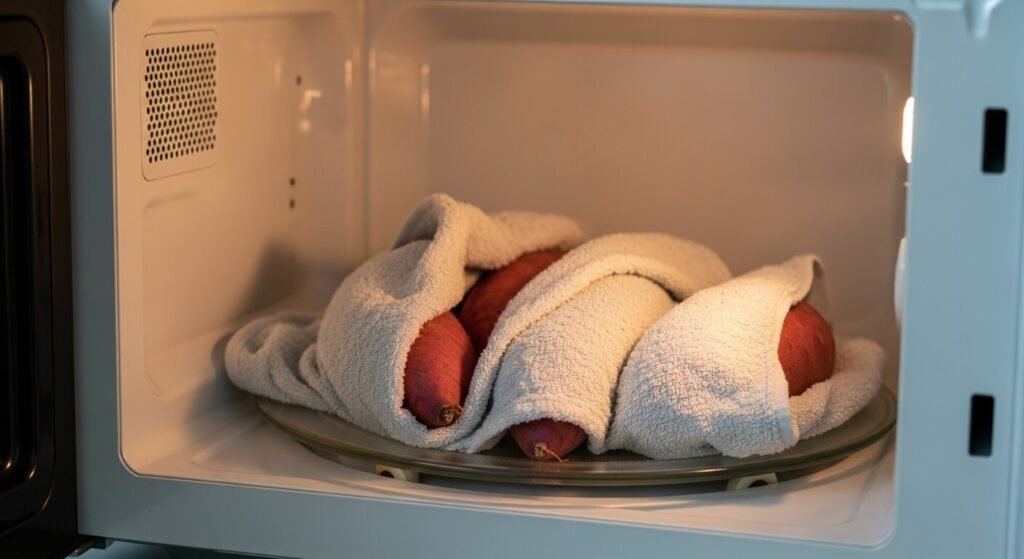 - 전자레인지 활용: 씻은 고구마를 젖은 키친타월로 꼼꼼히 감싸 비닐팩에 넣고 5분 정도 돌려주세요. 수분을 머금으며 익어야 훨씬 쫀득합니다.
