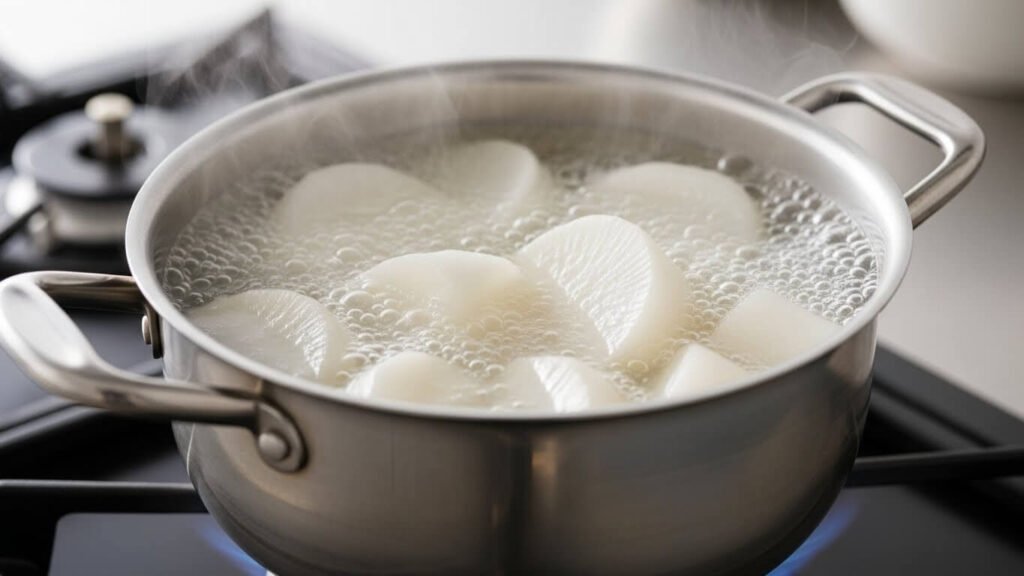 1. 시원한 육수 만들기 (무 선행 작업): 냄비에 물(1.2L)과 큼직하게 썬 무를 넣고 10분 정도 푹 끓여주세요. (시원함의 기초 다지기!)