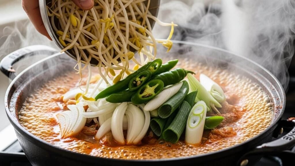 1. 채소 넣기: 양파, 콩나물, 청양고추를 넣고 5~7분 더 끓여주세요. (콩나물은 너무 오래 끓이면 질겨져요.)