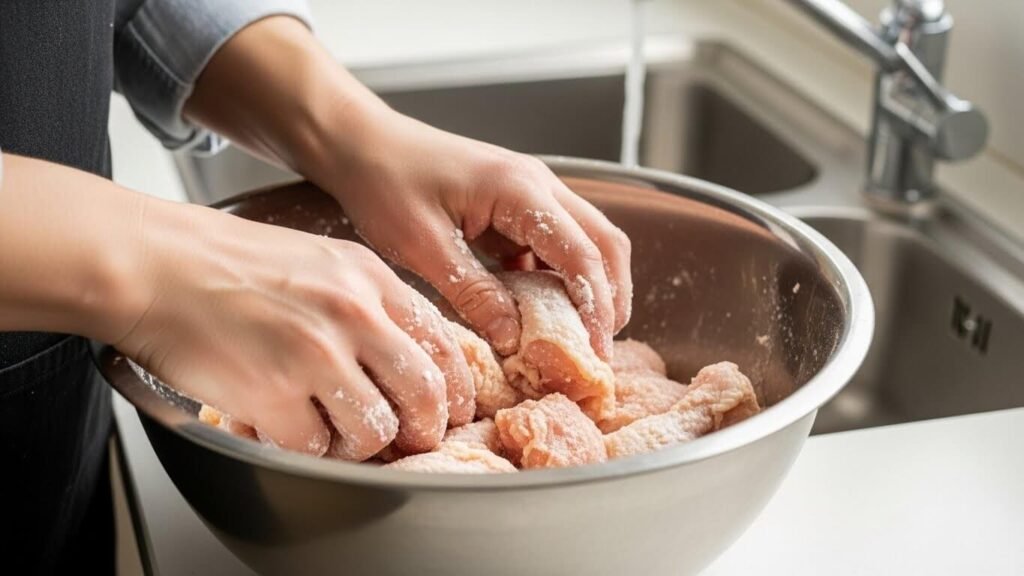 - 마사지: 씻은 닭에 소금(1)+밀가루(1)를 넣고 조물조물 힘줘서 문질러 주세요. (밀가루가 잡내와 불순물을 흡착합니다!)