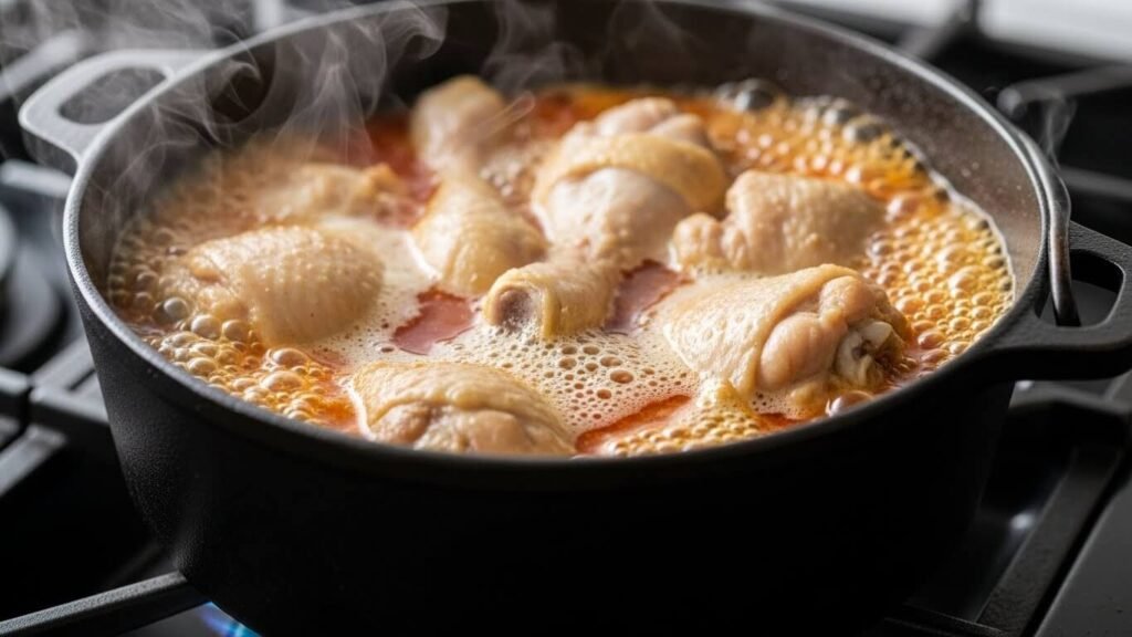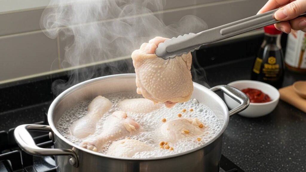 - ★필수 선택★ 한번 데치기 (Tip): 시간이 된다면 끓는 물에 닭을 넣고 2~3분간 살짝 데쳐주세요.