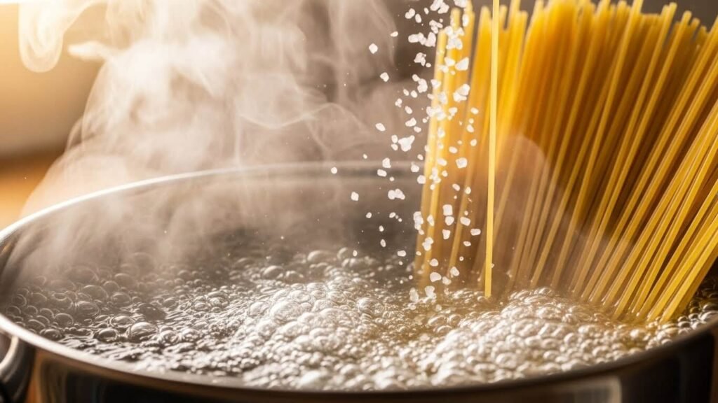 - 스파게티면을 넣고, 봉지에 적힌 시간보다 ‘딱 1분 덜’ 삶아줍니다. (나중에 팬에서 마저 익힐 거예요!)