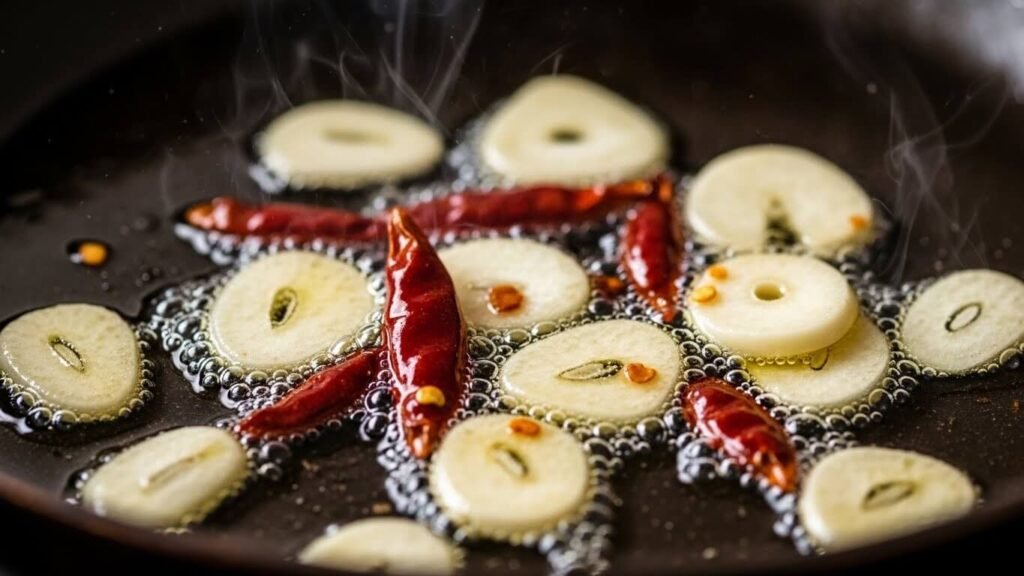 - Tip: 마늘이 연한 노란빛으로 변하고, 매콤하고 고소한 향이 스멀스멀 올라올 때까지! 절대 타지 않게 불 조절하는 것이 핵심입니다.