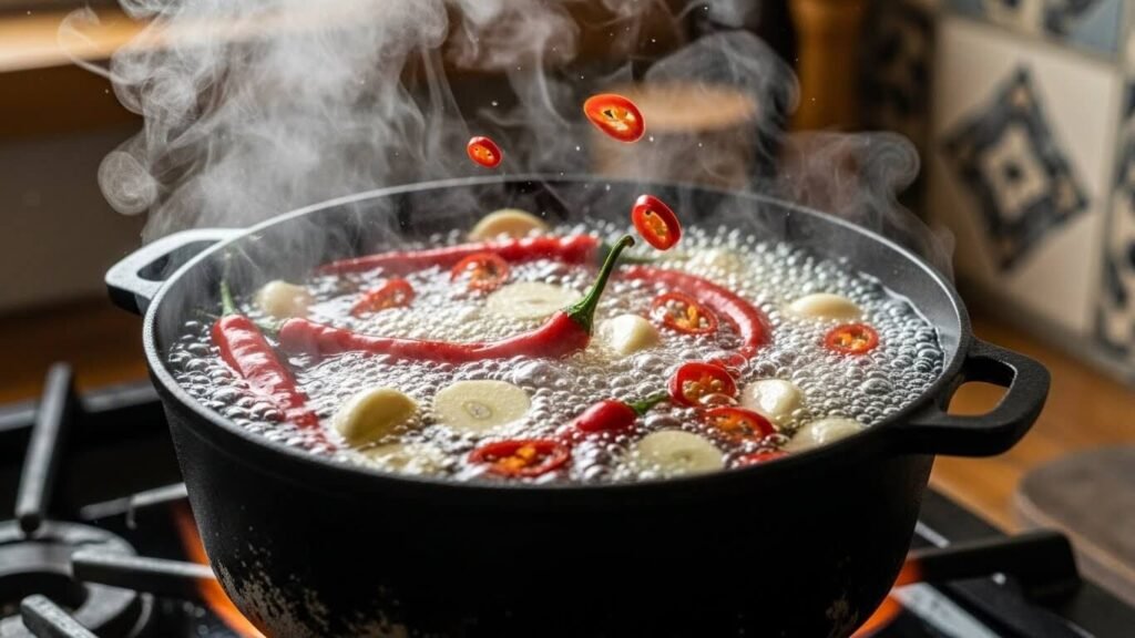 냄비에 물 500ml를 붓고 마늘과 고추를 먼저 넣어 끓입니다. 이때 매콤한 향이 올라오며 국물의 기초가 잡혀요.