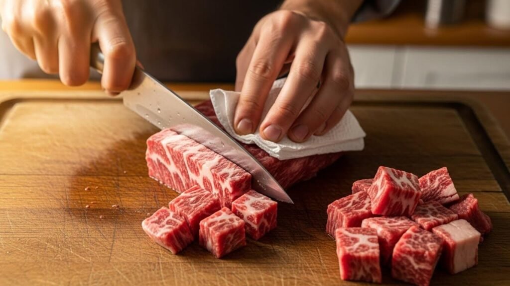 - 한 입 크기로 썰기: 고기는 2cm 정도의 정사각형 큐브 모양으로 썰어주세요. 젓가락이나 포크로 집기 가장 편한 사이즈랍니다.