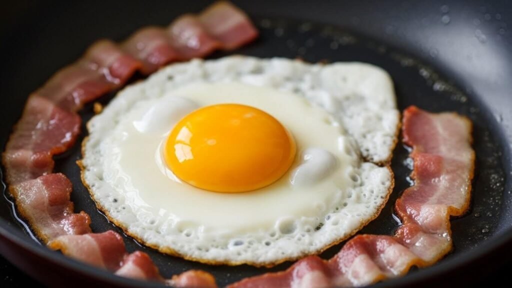 • 기름의 마법: 잘 구워진 베이컨은 잠시 덜어두고, 팬에 남은 귀한 ‘베이컨 기름’에 계란을 톡! 깨뜨려주세요. (버터를 한 조각 넣으면 더 맛있어요!)
