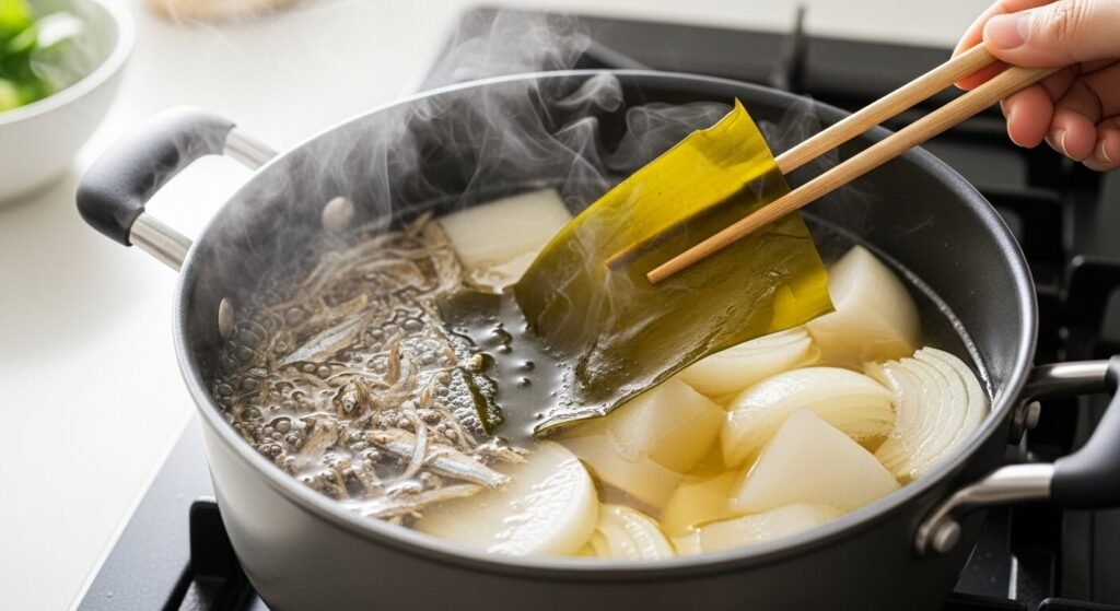 - 10~12분 정도 은은하게 끓여주세요.💡 꿀팁! 다시마는 물이 끓기 시작하면 바로 빼야 쓴맛 없이 깔끔해요!