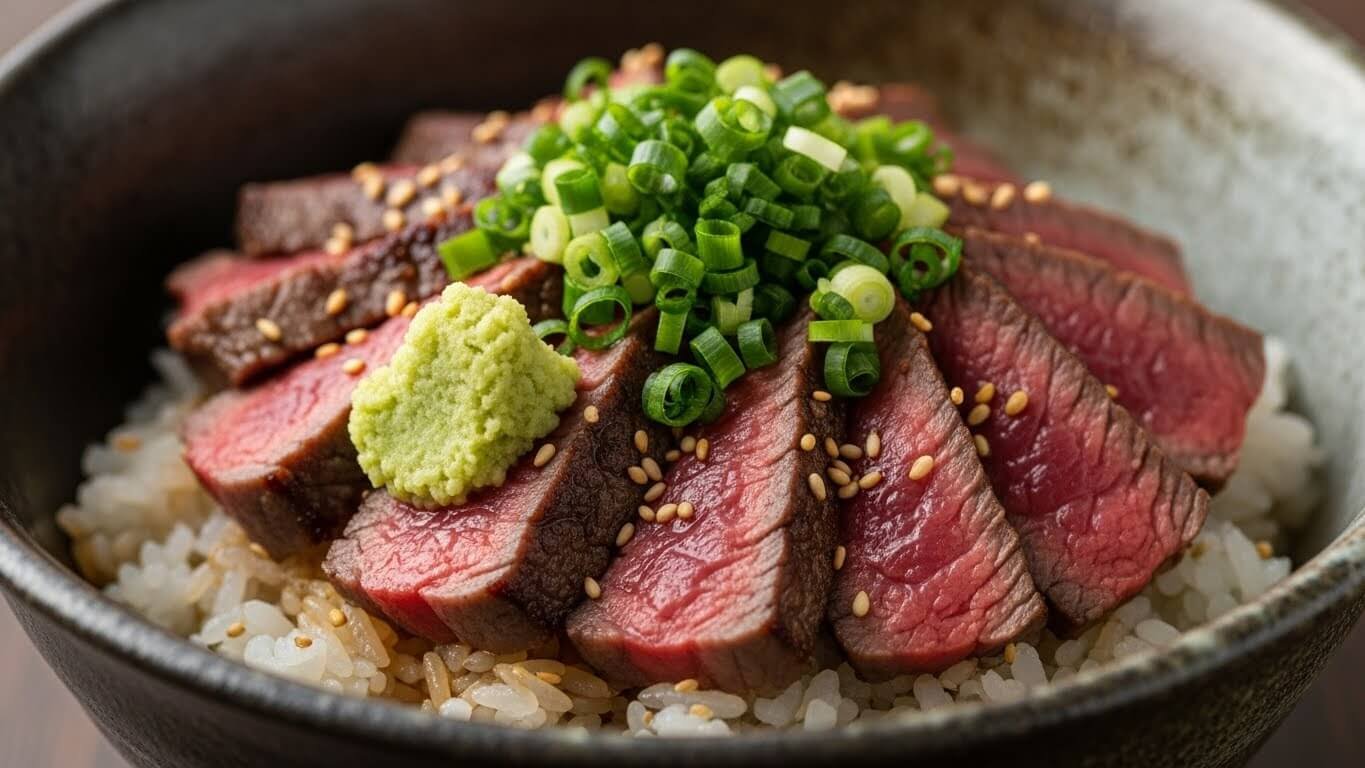 - 고기는 결 반대 방향으로 큼직하게 썰어 밥 위에 넉넉히 올립니다.