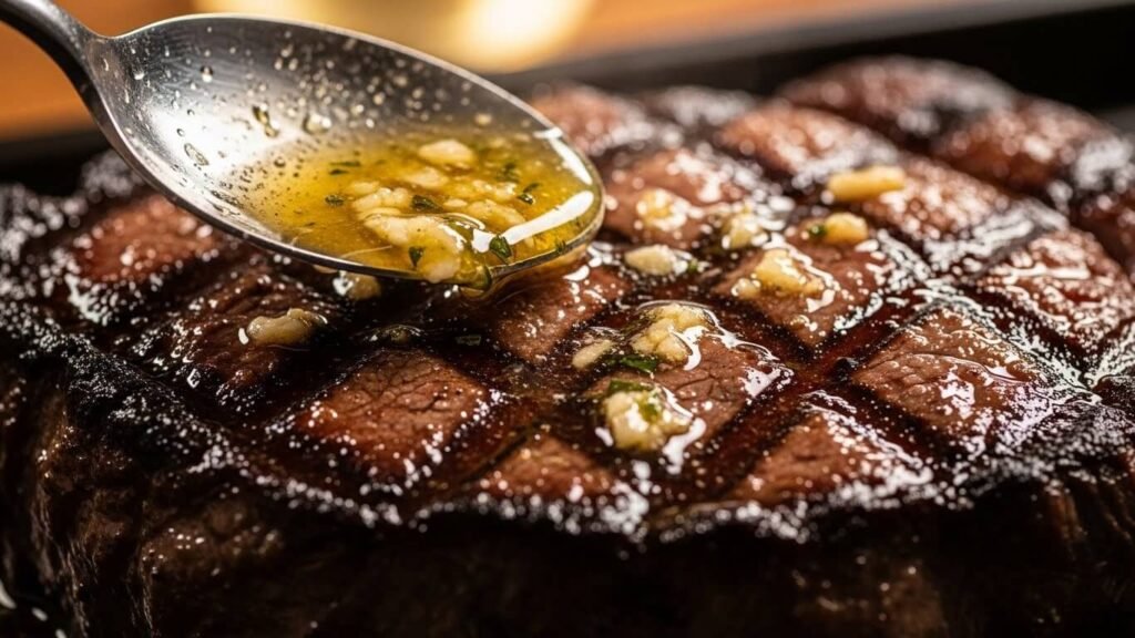 불을 중불로 낮추고 마늘과 버터를 넣어주세요. 녹은 버터를 숟가락으로 고기에 끼얹어주면 풍미가 고기 속까지 쏙쏙 스며듭니다.