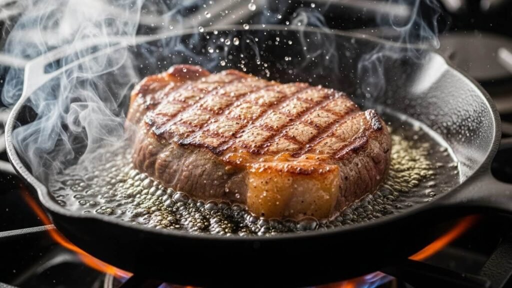 팬을 연기가 살짝 날 정도로 강불에 달궈주세요. 식용유를 두르고 고기를 올립니다. 겉면을 튀기듯 빠르게 구워 육즙을 가두는 게 포인트예요! (한 면당 1분~1분 30초면 충분해요.)