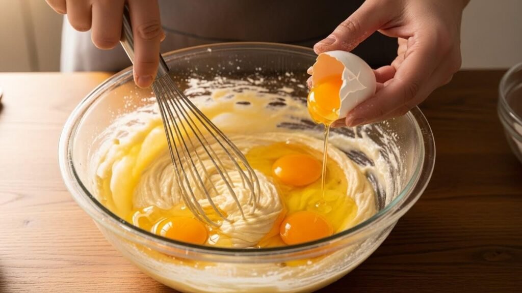 - 달걀 투하: 달걀을 하나씩 넣고 섞어야 분리되지 않아요! 바닐라 에센스도 이때 넣어주세요.
