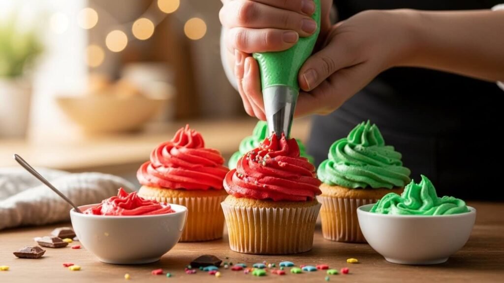 - 데코의 시간: 짤주머니에 색깔 크림을 넣고 컵케이크 위에 트리 모양이나 눈처럼 예쁘게 짜줍니다.
