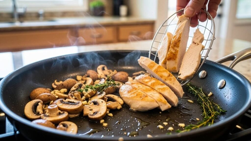 STEP 2. 단백질 투하! 버섯 향이 올라오면 닭가슴살과 다진 마늘을 넣습니다. 너무 오래 볶으면 퍽퍽해지니, 닭가슴살의 겉면이 하얗게 익을 때까지 빠르게 볶아주는 게 핵심입니다.
