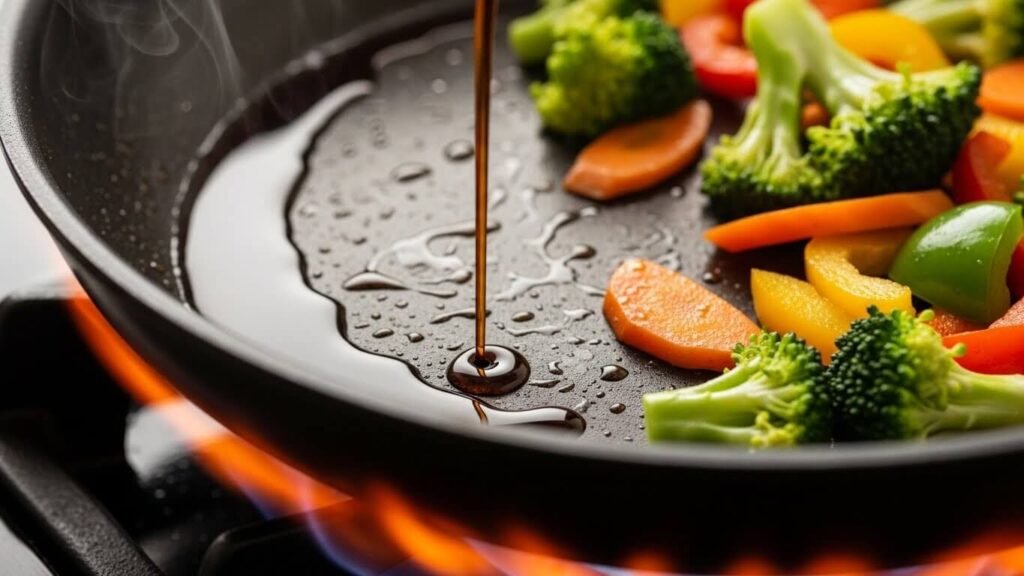 STEP 3. 최소한의 간으로 건강 챙기기 간장 1작은술을 팬 가장자리에 둘러 불맛을 살짝 입혀주세요. 향만 낸다는 느낌으로 가볍게!